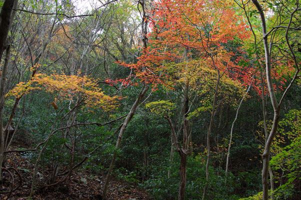 しばらく深戸谷に入っていないので数年振りに谷の紅葉を見に行こう。 遅いスタートなので有馬口まで電車で行き、水無谷入口に10時20分着。夏に来た時は大水だったが、今日はいつもの水の流れ 今年は全体にくすみがちな色だが、それぞれの雑木の色が落ち着いた雰囲気を醸し出している。 水無滝への道を右に逸れ、深戸谷への古い舗装林道に入る。 久しぶりなので取りつき場所が、さて何処だったかな〜^^; うっすら記憶にある場所から、落葉に埋もれた細い道に入る。 |