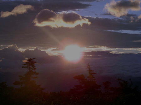 朝日岳山頂でご来光を見るため、小屋を4時過ぎに出発。緞帳のような雲に覆われて、歩き始め