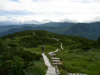 五輪高原は木道が敷かれた山上の湿原帯、広々とした高原を歩く足取りもこの辺ではまだ軽やか。