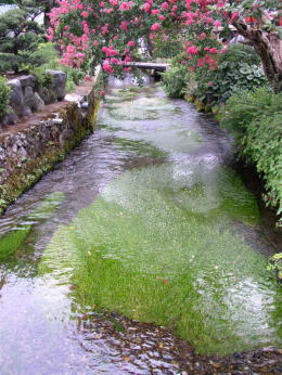 古い町並みの中を流れる清流には、白い小さな梅花藻の花が一面に咲いていました。離れてみると